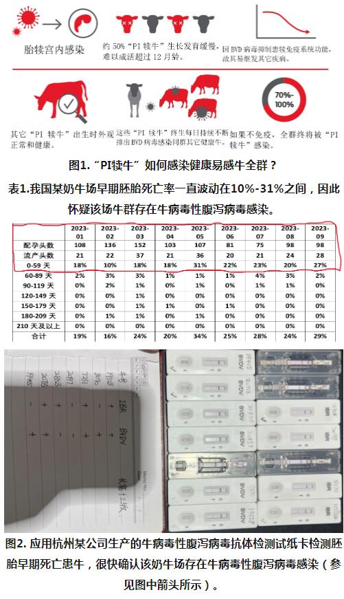 眾所周知,牛病毒性腹瀉病毒(Bovine Viral Diarrhea Virus=BVDV)R0值(基本傳染數(shù))并非一個(gè)固定值,而是一個(gè)范圍,取決于多個(gè)因素,如牛群管理方式、牛群密度、生物安全措施和病毒株等。然而,研究和模型提供了BVDV估計(jì)R0值。一般來說,牛群中BVDV的R0值范圍是2至5;這意味著在一個(gè)完全易感牛群中,一頭感染牛平均可以感染兩至五頭其它健康易感牛。另外,估計(jì)還顯示,“PI犢?!盧0值可能相當(dāng)高,在5至10甚至更高。這個(gè)高R0值反映了“PI犢?!痹诰S持和擴(kuò)散牛病毒性腹瀉病毒中的獨(dú)特重要作用,故使其成為控制和預(yù)防該病毒傳播策略的眾矢之的。不過,盡管“PI犢?!睂?duì)奶牛養(yǎng)殖業(yè)各個(gè)環(huán)節(jié)均構(gòu)成了重大威脅,但我國(guó)許多奶牛場(chǎng)包括多家國(guó)內(nèi)獸藥集團(tuán)甚至不知道其在牛群中存在。“PI犢?!笔菑哪概言衅陂g感染了牛病毒性腹瀉病毒的帶毒者?!癙I犢牛”外表上看起來一切正常,通常在其一生中并不表現(xiàn)出明顯臨床癥狀,但卻會(huì)源源不斷傳播牛病毒性腹瀉病毒給牛群中其它健康易感牛,這兒易感牛可理解為因未免疫而無能力抵御牛病毒性腹瀉病毒攻擊危害者,參閱圖1。感染牛群時(shí)常會(huì)出現(xiàn)無法解釋的健康問題,例如新生犢牛異常、早期胚胎死亡率高和流產(chǎn)率增高等。此外,感染牛群中的呼吸道疾病病例和斷奶體重低于標(biāo)準(zhǔn)的情況也會(huì)增加。本文依據(jù)北美奶牛臨床獸醫(yī)經(jīng)驗(yàn),向同道們簡(jiǎn)介如何有效根除“PI犢?!钡奈屙?xiàng)措施如下。