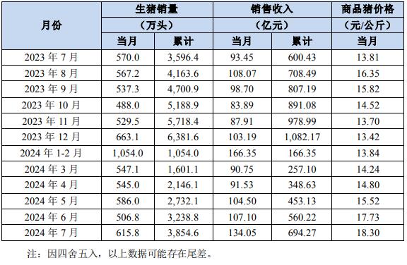 牧原股份8月5日發(fā)布公告,2024年7月份,公司銷售生豬615.8萬頭(其中商品豬562.3萬頭,仔豬49.3萬頭,種豬4.1萬頭),銷售收入134.05億元。其中向全資子公司牧原肉食品有限公司及其子公司合計(jì)銷售生豬89.7萬頭。