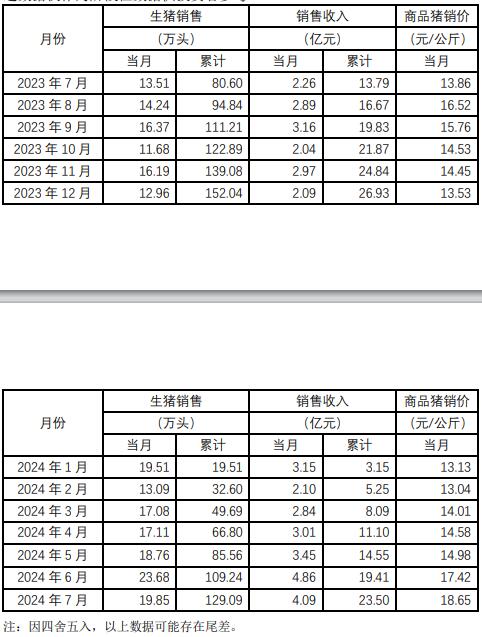 2024年1-7月,公司共銷售生豬129.09萬頭(其中商品豬119.33萬頭),銷售收入23.50億元。其中向集團(tuán)內(nèi)部屠宰企業(yè)銷售生豬19.55萬頭。