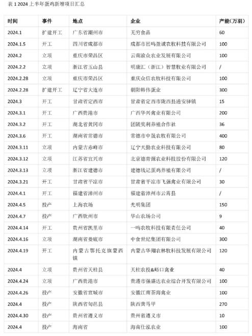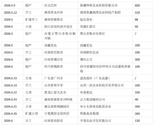 表1 2024上半年蛋雞新增項目匯總