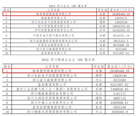 2024四川企業(yè)100強發(fā)布 新希望位列綜合榜單和制造業(yè)榜單“雙第一”