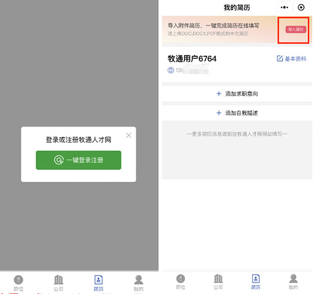 1、識(shí)別小程序碼或微信搜索“牧通人才網(wǎng)”,打開后“一鍵登錄注冊(cè)”(如下圖所示)。然后按照提示填寫簡(jiǎn)歷或?qū)敫郊?jiǎn)歷。(注:已在APP注冊(cè)完善簡(jiǎn)歷的求職者,小程序會(huì)同步信息,直接登錄即可。)