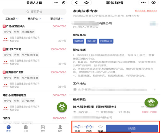 2、點(diǎn)擊底部狀態(tài)“職位”搜索意向崗位??蛇x擇意向工作地區(qū),意向崗位,篩選薪資范圍及工作經(jīng)驗(yàn)等。找到意向職位后點(diǎn)擊“投遞”即可,也可直接在線溝通,崗位分享好友等。若該崗位您特別中意可點(diǎn)收藏,后期可在“我的”—“職位收藏”頁(yè)面查看進(jìn)展。